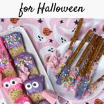 - Monster pretzel rods – Dip the pretzel rods in white chocolate or white candy melts, then add eyes. You can do one large one, two smaller ones, or add as many eyeballs as you like!