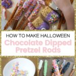 Before we get into the nitty-gritty of how to make these yummy chocolate pretzel rods, let me show you the visual proof of how easy these are to make—and how cute these Halloween dipped pretzel rods turned out!