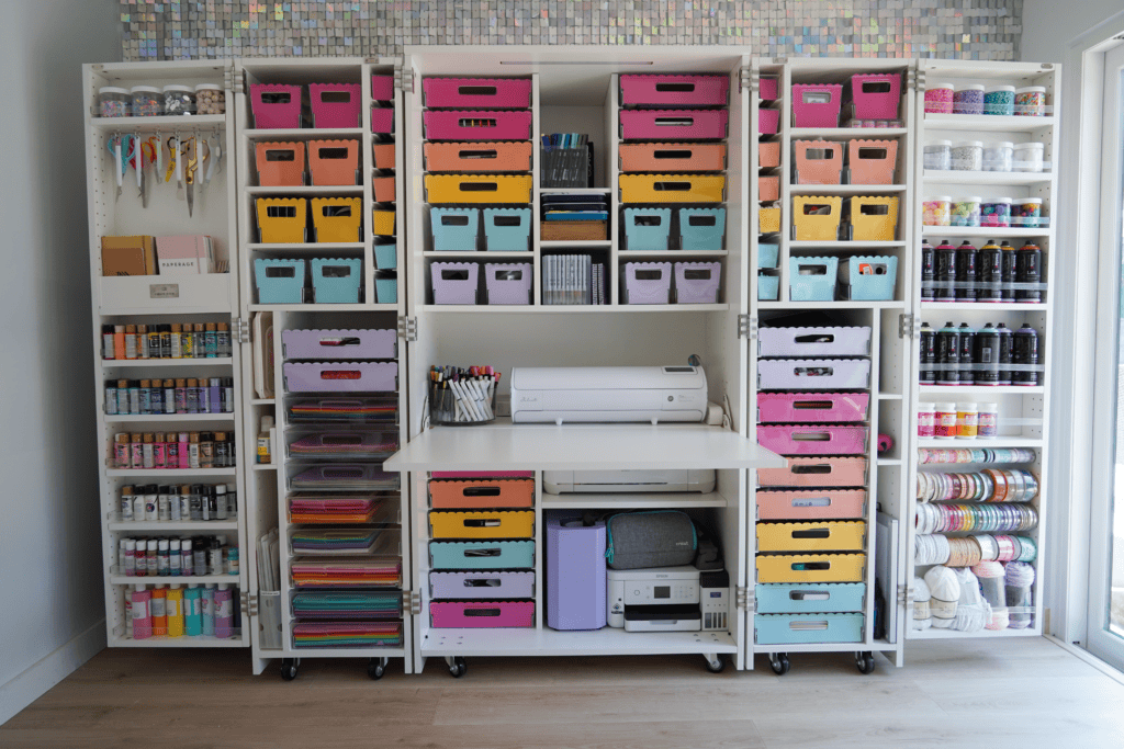 With multiple configurations, including shelves, drawers, and compartments, it’s perfect for organizing everything from paper to paints to cutting machines and sewing supplies…and everything in between!