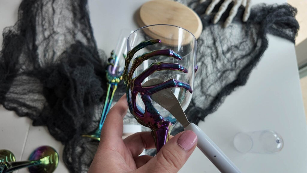 Again, use your spatula to gently wedge between the skeleton hand and cup to loosen. After a little bit of work, you can twist and pull carefully on the cup until it releases.